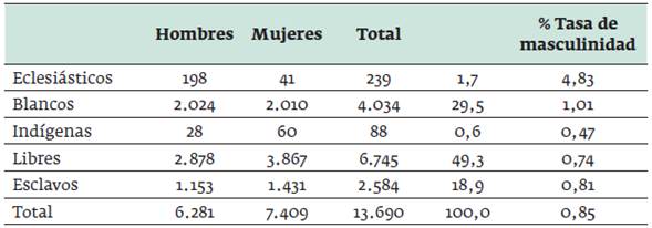 Cartagena, por su parte, vio fortalecido su ciclo militar,3 íntimamente ligado a in- novaciones que abarcaron la administración, las finanzas, el comercio y la defensa (Segovia y Sourdis, 2003; Múnera, 1998). La política comercial buscó recaudar recursos para la recuperación de la metrópolis, y la defensiva tuvo como propósito resguardar a la región con respecto a las potencias extranjeras. La función defensiva le otorgó a la ciudad importantes beneficios, dada “las inversiones de millones de pesos en sostenimiento del ejército fijo y en obras militares [que] significaron una inyección muy saludable en la desfallecida economía (Múnera, 1998). Según las interpretaciones del censo del mencionado año, la ciudad tenía 13 690 habitantes, entre los cuales los esclavos (2584) representaban el 18,9 % del total de la población. Así se observa en el registro de población total de la ciudad.