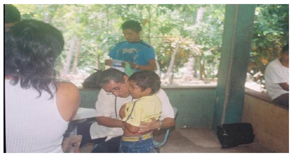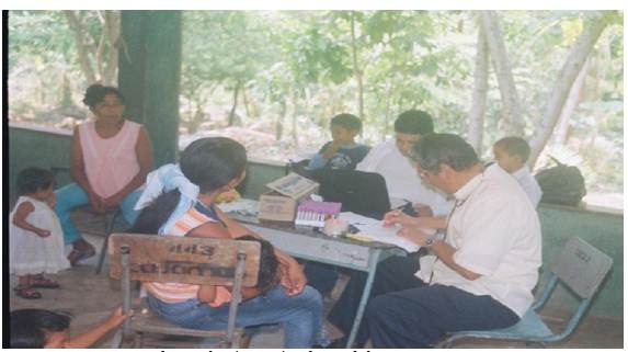 El grupo de investigación contactó al cabildo de los Ette Enaka del resguardo NK, y se acordó realizar una visita tipo brigada de salud para revisar a las personas con síntomas de enfermedad, y conocer el estado básico de salud por medio de un examen de sangre (hemograma completo). Con esta misma muestra, y previo consentimiento informado aprobado por el Comité de Bioética de Investigación de la Universidad Cooperativa de Colombia, sede Santa Marta (Resolución 024 de 2010), todas las personas participantes firmaron el consentimiento informado para tomar las muestras y extraer el ADN para investigar los genes CYP2C19, NAT2 y las moléculas HLA. Se realizaron tres visitas al resguardo Naara Kajmanta; en la primera acordamos el plan de trabajo a seguir; en la segunda acudimos con el equipo de salud en compañía de dos enfermeros graduados estudiantes de medicina con los presentes que la comunidad nos habían solicitado para algunas necesidades; en esta ocasión examinamos medicamente a varios niños y adultos y procedimos a la toma de muestra de sangre venosa previa firma del consentimiento informado; en la tercera visita llevamos los resultados del hemograma y los medicamentos que necesitaban de acuerdo con los resultados, y lociones dérmicas protectoras. En las figuras 3 y 4 se observan las evidencias de la visita.