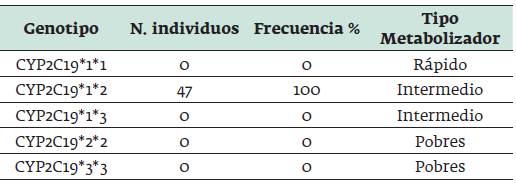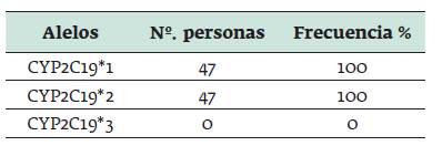Tabla 2 Frecuencias genotípicas del gen CYP2C19 y tipo metabolizadores