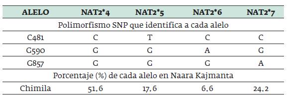 Tabla 3 Los 4 principales alelos del NAT2* y el porcentaje de cada alelo encontrado en la población Naara Kajmanta