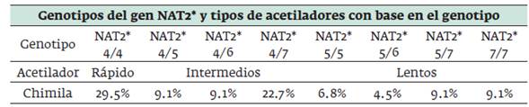 Aunque para este gen hay varios alelos reportados, se investigaron los más frecuentes. El alelo NAT2*4 es el más frecuente en todas las poblaciones humanas, por lo tanto, es el considerado salvaje u original; su función es normal. La función de los otros alelos de la tabla es defectuosa. Las enzimas de estos genes metabolizan acetilando medicamentos como los antibióticos Isoniazida y Rifampicina, que son los de primera línea en el tratamiento de la tuberculosis. Los resultados del gen NAT2 se observan en las tablas 3 y 4 (Arias et al., 2014).