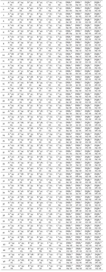 Determinan las moléculas de su mismo nombre. Las de tipo II activan la respuesta inmune para combatir patógenos externos, y las del tipo I presentan las proteínas que producen las células como un mecanismo de vigilancia interna. Pero también las investigaciones han demostrado su importancia para esclarecer el origen ancestral, la evolución y migraciones de las poblaciones. La tabla 5 muestra los resultados de los genes HLA en la población de Naara Kajmanta (47 chimilas). Tabla obtenida de www.allelefrequencies.net No3426 de acceso abierto (Arnaiz-Villena et al., 2018).