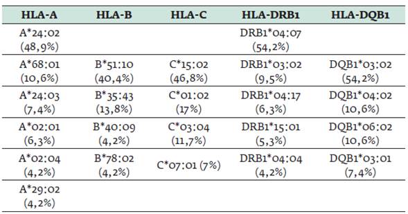 Tabla 6 Alelos HLA con mayor frecuencia encontrados en la población