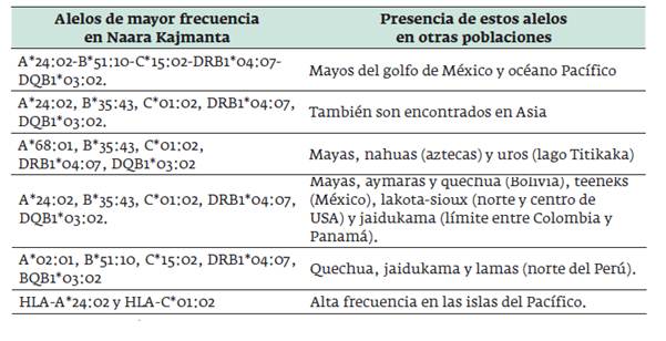 La tabla 6 muestra los alelos HLA más frecuentes y la tabla 7 muestra una homología entre los alelos HLA encontrados en la población Naara Kajmanta y alelos de otras poblaciones, observándose una fuerte relación genética (ancestral) con otros grupos amerindios, como mayos del golfo de México y océano Pacífico; nahuas de México y Centroamérica (Arnaiz-Villena A. et al. 2020a); uros, aymaras, quechuas de Bolivia; lamas del norte de Perú (Arnaiz-Villena A. et al. 2020b); jaidukamas en los límites de Colombia y Panamá; y una fuerte relación de los HLA-A*24:o2 y HLA-C*oi:ü2 con los aborígenes de las islas del pacifico (Arnaiz-Villena et al., 2019; Arnaiz-Villena et al., 2020c). Bolinder, quien los visitó en 1920, tuvo razón al afirmar que estaban relacionados con los indígenas de Centroamérica.