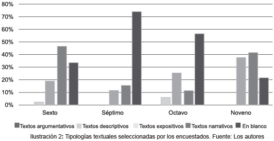 La carencia de textos que sean útiles para la vida diaria se observa en esta investigación como un tema de atención a la lectura. Los programas y currículos evidencian un marcado énfasis en la lectura de tipo narrativa (mitos y leyendas) excluyendo las demás tipologías establecidas en los planes de área o mejor aún por las vanguardias, o por la literatura moderna, por los discursos, sociales y políticos, humanísticos y técnicos, por los discursos en que están, en los géneros explicativos-expositivos y argumentativos, que son tan importantes para alcanzar el reto del aprendizaje del discurso universitario y social.