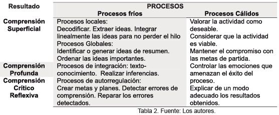 En este proceso de lector competente y lector implícito en las funciones que se deben de abordar en la lectura, Sánchez, García, & Rosales, proponen distinguir entre dos tipos de lector, el cálido y el frío. Procesos que se ubican en las fases durante y después de la lectura de un texto. La tabla 2 es un modelo completo para entender la comprensión lectora: procesos cálidos y fríos de los mismos autores mencionados. Permite conocer de forma adaptada su intención.