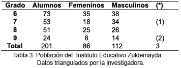 En un comienzo la investigación contó con varios tropiezos, entre ellos el hecho de que solo una institución participó en la aplicación del cuestionario. Este limitante en principio, no permitió realizar una triangulación de los datos con otras instituciones o lo que era aún mejor; comparar la percepción que por sectores se tenía pre-establecido hacer, y así se pudieran confrontar las preguntas con la escala de valoración planteada en el cuestionario. Sin embargo, hay que resaltar que el cuestionario tuvo una acogida importante en cuanto a la población que pudo recibir la encuesta, lo que permitió obtener una información más puntual de los estudiantes participantes de la Institución Educativa Zuldemayda, con la diferencia de (grados, edades y sexos). Vale aclarar que con el obstáculo presentado, se puede resaltar el hecho de que los resultados obtenidos fueron satisfactorios y la información permitió dar un aporte más al estado actual de las competencias lectoras en el municipio de Armenia, entre sus jóvenes estudiantes y los que pertenecen al centro educativo. Toda investigación en el campo de la educación cuenta con un carácter importante que se debe resaltar y es el hecho de ubicar el eje problemático en el marco de la detección de necesidades. Esta investigación no sería posible si la investigadora no contara con la experiencia de la enseñanza en el sector público y privado, pero a su vez en cuanto al contexto que hace parte de la realidad de la investigación. Contextualicemos, los cuestionarios fueron creados, adaptados y aplicados en las Institución Educativa Zuldemayda, correspondiente a la comunidad de la zona sur del municipio de Armenia del departamento del Quindío. La aplicación del cuestionario pese a sus modificaciones y validaciones, contó con una muestra significativa de 201 estudiantes. Vale aclarar que la institución tenía inscritos 221 estudiantes en los grados de 6 a 9, en el año 2011. La triangulación de la información se realizó de acuerdo con el género, la edad (extraedad) que aparece como factor permanente en nuestro sistema educativo, debido a circunstancias ejemplares como deserción escolar, traslados de vivienda, en algunos casos la característica de extrema pobreza que se vive en los departamentos y municipios de Colombia, generando que en los grados nos encontremos con estudiantes de 16 o 18 años en grados como 7,8 y 9. Podemos observar que la siguiente tabla presenta una variación por género. Los datos que aparecen en paréntesis (*), corresponden aquellos de estudiantes que no marcaron la respuesta, conocido como datos en blanco: