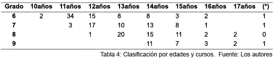 Ahora observemos la tabla 3 donde se realizó un conteo especial por edad/grado. Se observa una variación de extraedad14 como mencionábamos en los grados. En este aspecto se encontró una población diversa que no corresponde en edad, al curso en relación. De igual manera, el grado 6 es el que presenta una población más heterogénea en cuanto a la edad. En los grados Es importante tener en cuenta que la 7 y 8 se observa una población alta de niños investigación giró en torno al municipio de entre los 13 y 15 años. Edad que corresponde Armenia, debido al conocimiento del investigador al grado noveno. En el grado noveno se observa sobre su contexto. También es necesario aclarar una población estándar correspondiente con el que delimitar las variables en una investigación nivel escolar. Favorece al momento de hacer una revisión de los resultados, tanto en variables dependientes como independientes. En cuanto al concepto de edad y extraedad, el centro educativo como muchas otras instituciones en Colombia, presenta este factor de una edad que no se corresponde con su grado académico, y que vale la pena recordar que los factores que en principio se pueden asociar allí son, repetir grados escolares por no superar la meta académica, problemas a nivel cognitivo, deserción escolar, etc.