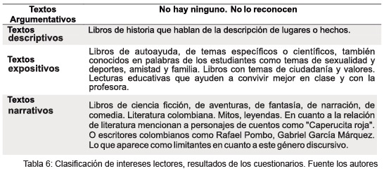 Antes de finalizar la prueba se dio la opción de proponer a los estudiantes sugerencias sobre qué tipo de lectura les gusta trabajar más y cuáles recomendaban para ser trabajadas en clase de forma constante. En la agrupación de la información se toma en cuenta la clasificación textual para separarla de los textos mencionados por los estudiantes, entre ellos se encontraron, cuentos, leyendas, libros de ciencia ficción o libros de historias que se clasifican en la tabla 6, clasificación de intereses lectores, en donde podemos evidenciar que están limitados por los únicos tipos de lecturas que conocen, lo que demuestra que existe muy poca difusión sobre literatura actualizada, que el mismo profesor desconoce.