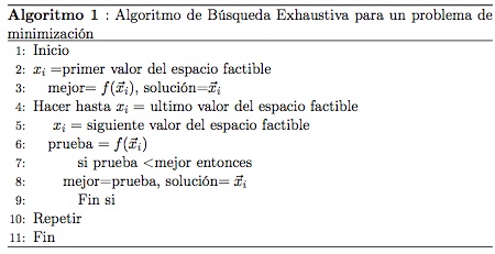 Es una técnica simple y, además, eficiente en algunos problemas pequeños. Se considera útil para los denominados problemas P, cuyo tiempo de cómputo crece de manera polinomial [28]. Cabe mencionar que en problemas grandes o complejos es necesario tener una clara metodología de la generación de las soluciones y la forma de avanzar en el espacio de búsqueda. A continuación se muestra el pseudocódigo para un algoritmo de búsqueda exhaustiva 1.