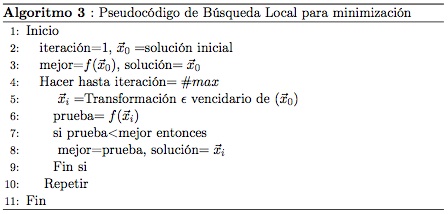 Este procedimiento se basa en el principio d optimalidad próxima [33], el cual afirma que las soluciones buenas se encuentran cercanas entre sí y, en consecuencia, comparten una estructura común. Aunque este principio no puede generalizarse para todos los problemas, es muy importante a la hora de diseñar un algoritmo de búsqueda local eficiente. A continuación se muestra el Algoritmo 3, donde se toma