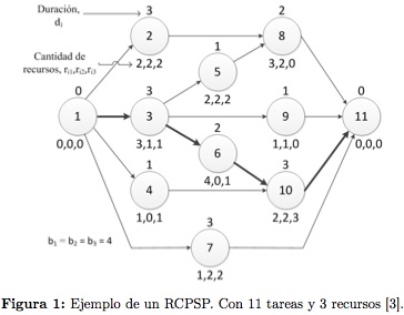 De manera formal puede definirse el RCPSP de la siguiente manera [3]: Sea un proyecto compuesto por un conjunto de n actividades X = (1,..., n), cada una de las cuales utiliza una cantidad de recursos rik para su realización, donde i es la actividad y k es el recurso. Además, bk es la cantidad total disponible del recurso k y di representa la duración de la actividad i. Las actividades 1 y n son actividades ficticias que representan el inicio y la finalización del proyecto [4], con duración y consumo de recursos iguales a cero.