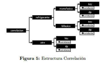 Etiqueta ''correlación'': En esta etiqueta se almacenó la información sobre las correlacciones que se aplicarán al fluido interior y exterior. Además si el fluido tiene un cambio de fase se debe especificar la correlación para flujo bifásico, estas correlacciones son para el cálculo de la caída de presión y el cálculo de coeficiente de transferencia de calor. La estructura utilizada se observa en la Figura 5.