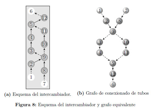 La representación de la interconexión de los tubos se realizó mediante grafos dirigidos. Considere, por ejemplo, que se tiene un simple intercambiador de calor como se muestra en la Figura 8a(a), donde los tubos están enumerados de abajo hacia arriba y de izquierda a derecha, y las líneas discontinuas representan que la conexión de los tubos se realiza en la parte posterior del intercambiador. Las conexiones de los tubos de este intercambiador están representadas mediante el grafo presentado en la Figura 8b(b). A partir de este grafo se genera una matriz adjunta del interconexionado de los tubos, posibilitando identificar la entrada del refrigerante. Como físicamente un tubo no puede ser conectado con si mismo, la conexión del tubo consigo relaciona el tubo como una entrada de refrigerante al intercambiador, haciendo uso de las reglas que se presentan a continuación.