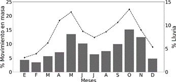 Figura 13 Variación mensual de la lluvia (linea no continua) y los movimientos en masa porcentual (barras) en el Valle de Aburrá.