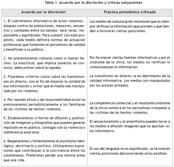 Los cuestionamientos y reflexiones respecto a la evidente baja calidad informativa que ofrecen los medios de comunicación y a la responsabilidad social que tienen con el país en cuanto a la cobertura del conflicto armado así como la posibilidad de que la CNTV aceptara (en 1999) un Proyecto de acuerdo que regulaba el cubrimiento de actos violentos y que fue percibido por los periodistas y hasta por el entonces Presidente Pastrana como inconstitucional, motivaron la firma del "Acuerdo por la discreción" por parte de 32 directores de medios de comunicación el 4 de noviembre de 1999 (Velásquez, Gutiérrez, 2001). Puesto que el Acuerdo surge de una reflexión sobre la calidad informativa, se puede observar que cada uno de los seis puntos que lo componen se relaciona con alguna de las críticas dirigidas a los medios y en particular a los periodistas.