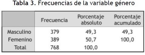 En relación con el género vemos en la tabla 3, que el 50,7% de la población pertenece al género femenino, mientras el otro 49,3% pertenece al género masculino.