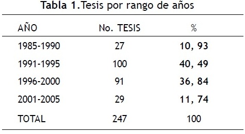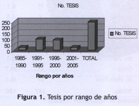 Adicionalmente, por rango de años (1985-1990, 1991-1995, 1996-2000, 2001-2005), se encontró que durante el período 1991-2000 se produjo el mayor número de trabajos de grado, 100, equivalente al 40.49%, seguido del rango 1996-2000, con un 36.84%. a continuación se presenta la figura 1 se evidencia lo anteriormente dicho.