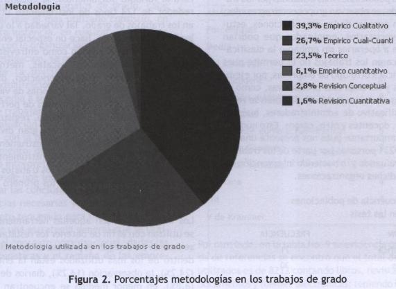 Se observa que para el desarrollo de los trabajos de grado, la metodología más relevante fue la empírica cualitativa con un 39.3% que equivale a 97 trabajos; dentro de los trabajos revisados también hubo relevancia pero en un menor porcentaje en la metodología empírica cuanti-cualitativa con un 26.7% y teórica con un 23.5%. Esto una mayor tendencia a realizar trabajos empíricos que trabajos teóricos (ver figura No. 2).