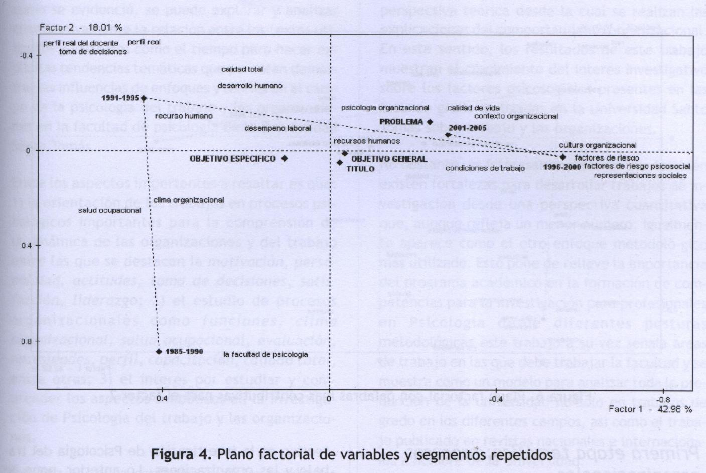 Aunque el período comprendido entre los años 2001 y 2005 mantiene dentro de las palabras más utilizadas la expresión significados y psicosocial, la mayor parte de ellas se centran en teorías propias de la psicología organizacional. Datos que son consistentes con los resultados presentados en el análisis de correspondencias.