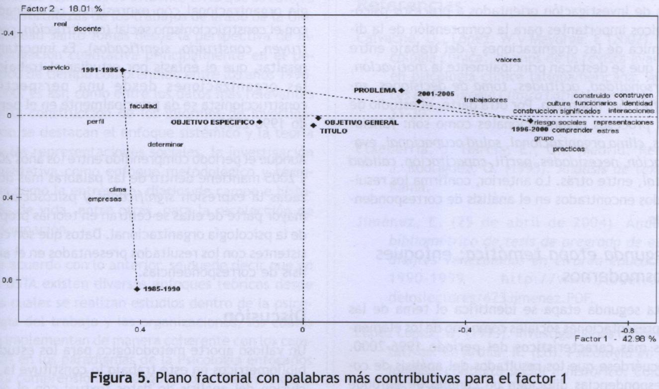 Esta segunda etapa se identifica el tema de las representaciones sociales como uno de los elementos más característicos del período 1996-2000. Recuérdese que los resultados del análisis de correspondencias dilucidan un cambio de enfoque teórico en la investigación de Psicología del trabajo y las organizaciones. Lo anterior, pone de manifiesto el interés por estudiar y comprender los aspectos simbólicos en el marco de la psicología organizacional con expresiones relacionadas con el construccionismo social (construcción, construyen, construido, significados). Es importante resaltar, que el énfasis por estudiar el trabajo y las organizaciones desde una perspectiva construccionista se da principalmente en el período 1996-2000.