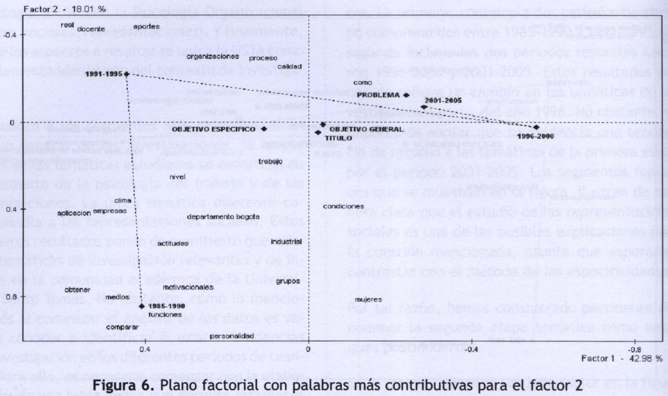 En lo que se refiere al segundo factor en la figura No. 6 se puede observar el interés por investigar procesos, elementos temáticos que, en coherencia con el anterior, evidencian el interés por comprender las prácticas culturales y relacionadas con la psicología del trabajo y las organizaciones. De manera más clara se puede apreciar con segmentos precisos como son desempeño laboral, clima organizacional y salud ocupacional. En coherencia con lo anterior, consideramos relevante denominar la primera etapa temática procesos organizacionales.