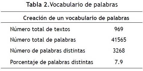 El tratamiento de los datos comienza con la segmentación del corpus en palabras. En la tabla No. 2 se encuentran datos que aportan una primera información sobre la longitud y el vocabulario del corpus que, como se mencionó anteriormente, está compuesto por título, pregunta de investigación, objetivo general y objetivos específicos durante el período comprendido desde 1985 hasta 2005. El corpus tiene una longitud de 41565 palabras y está formado por 3268 palabras distintas.