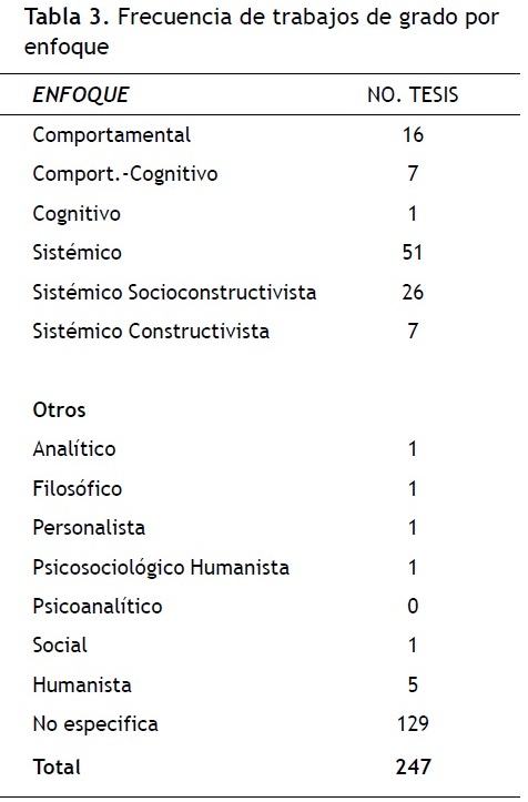 Sobre la variable número de tesis por enfoque, se encontró que los más utilizados son: el sistémico (84) mencionados en los trabajos de grado como enfoque sistémico (51), sistêmico socioconstructivista (26) y sistémico constructivista (7); con menor frecuencia se encuentra el enfoque cognitivo - comportamental (24), mencionados como: comportamental (16), cognitivo -comportamental (7), cognitivo (1), y otros (10) (ver tabla No. 3). Sin embargo, el mayor porcentaje es para los trabajos que no especifican el enfoque teórico y/o epistemológico (129) desde el cual se aborda el trabajo.