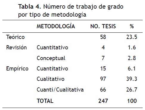 Para analizar el número de tesis de acuerdo con la metodología, se observa que la clasificación tenida en cuenta incluye metodologías de varios tipos a saber: teórico, de revisión -cuantitativa, conceptual- y empírico -cualitativo, cuantitativo-). La tabla No. 4, expone los tipos de metodología usada en las 247 tesis.