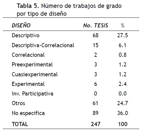 Por otro lado, en la tabla No. 5, se presentan los datos que corresponden a la variable diseño. Allí se muestra que el tipo de diseño más utilizado en los trabajos es de tipo descriptivo (68) y que en gran parte de otros documentos no especifican el tipo de diseño (61).