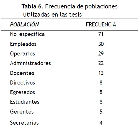 Dentro de las poblaciones más utilizadas por los trabajos de grado, se observan grupos como egresados, operarios en general de las organizaciones, estudiantes universitarios, empleados que podrían homologarse a operarios sin embargo la clasificación temática en los trabajos no lo permite pues hace referencia a otro tipo de empresas, por ejemplo servicios y no empresas productivas, como es el caso de los operarios (tabla 6). También se ve un número significativo de administradores, huéspedes de hotel, docentes y otros cargos. Este número de datos es importante pues nos presenta una cobertura de 9231 personas por parte de los trabajos de grado, evaluando y/o haciendo intervención directa sobre dichas organizaciones.