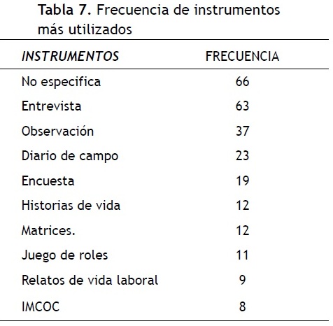 Para la variable instrumentos, se encontraron alrededor de 174 tipos de instrumentos utilizados en los trabajos de grado. Tal variedad a lo largo de los trabajos de grado, hace un especial énfasis en los métodos de evaluación como entrevistas, observación, cuestionarios, escalas, métodos de autocontrol, técnicas de observación, diseño y validación de instrumentos, historias de vida, diarios de campo, encuestas, análisis de perfiles, de cargo, evaluación del desempeño, registros, entre otros. Aquí se evidencia una gran diversidad de métodos de evaluación y de instrumentos. En la tabla No. 7 se presentan los instrumentos más frecuentemente utilizados por los trabajos de grado. Se aclara que se escogen los primero 10 más representativos.