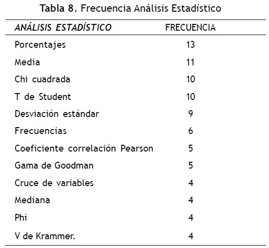 Dentro de los trabajos de grado revisados con metodología cuantitativa se observó que los resultados corresponden a estadísticas de tipo descriptivo (tabla 8), tales como el porcentaje (16.9%) y la media (14.3%).