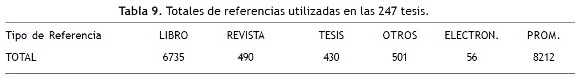 Por otro lado, en la tabla No. 9 se evidencia que en el análisis de referencias se encontró que el total de documentos utilizados es de 8212 contando libros, revistas, tesis, otros documentos y fuentes electrónicas; teniendo en cuenta que las fuentes fueron utilizadas en repetidas ocasiones. El mayor número de fuentes utilizadas corresponde a libros (6735), 501 de otros documentos (manuales, diccionarios, documentos memorias de congresos y seminarios, documentos institucionales, guías, enciclopedias, etc.), 490 revistas, 430 trabajos de grado y en menor cantidad (56) las referencias electrónicas. Como resultado se tiene un promedio 33.25 referencias por tesis.