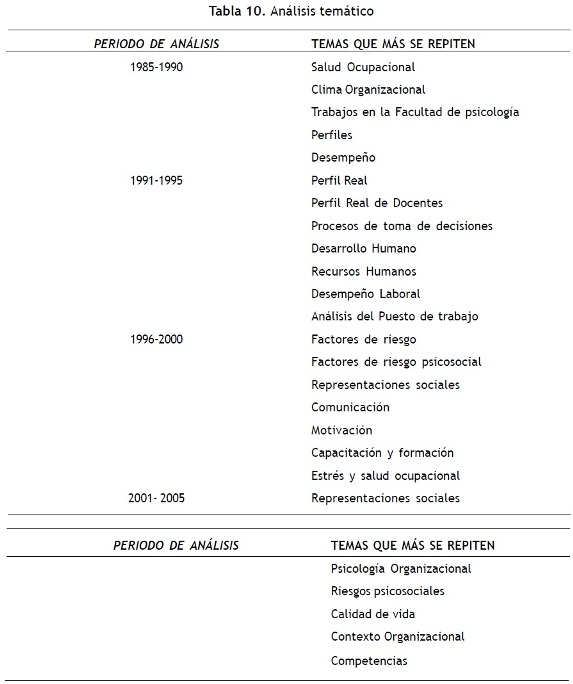 Para la clasificación temática de los trabajos de grado (se revisaron las 247 tesis) y se tomaron -manualmente- los temas que más se repetían de acuerdo a los períodos de años tomados para realizar el análisis. Se diferenciaron aproximadamente 25 áreas en la producción total de 247 trabajos. Para el período 1985-1990, se presentan temas como salud ocupacional, clima organizacional, trabajos realizados en la facultad de sociología, desempeño y perfiles. Para el segundo período, 1991-1995, los temas se centran en perfiles, toma de decisiones, calidad total, desarrollo humano, recursos humanos y análisis del puesto de trabajo. Para el tercer período, 1996-2000, los intereses temáticos se evidenciaron alrededor de áreas como actores de riesgo, riesgo psicosocial, representaciones sociales, comunicación, motivación, capacitación y temas de formación, estrés y salud ocupacional. Y en el cuarto y último período, 2001-2005, están como áreas de mayor interés representaciones sociales, riesgos psicosociales, calidad de vida, psicología organizacional, contexto organizacional y competencias. En los cuatro períodos temáticamente se reflejan los énfasis teóricos, metodológicos y epistemológicos fortalecidos en los 26 años de historia de la Facultad de psicología de la Universidad Santo Tomás. En este sentido, resulta importante para el grupo de investigación, el mismo campo de psicología del trabajo y las organizaciones, en particular y para la Facultad en general, evidenciar las tendencias temáticas, teóricas y metodológicas que se han presentado en esta corta historia.