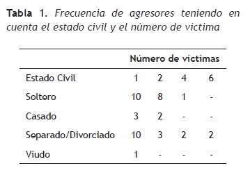 Como se aprecia en la Tabla 1, diecinueve (19) internos solteros agredieron hasta cuatro víctimas, y diecisiete (17) internos separados/divorciados agredieron hasta seis víctimas. Cinco (5) agresores casados atacaron hasta dos víctimas y el único agresor viudo de la muestra atacó sólo a una víctima. El mayor número de agresores se ubican en la categoría soltero y separado/divorciado.