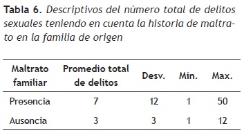 La Tabla 6 presenta los descriptivos del número total de delitos sexuales teniendo en cuenta la historia de maltrato en la familia de origen. De acuerdo con esta Tabla, los agresores que tienen historia de maltrato familiar han cometido en promedio siete delitos sexuales mientras los que no fueron maltratados han cometido tres delitos en promedio. Los agresores con antecedentes de maltrato han cometido entre 1 y 50 delitos sexuales a diferencia de los que no tienen tal antecedente, quienes han cometido entre 1 y 12 delitos sexuales. Este resultado señala que los agresores que han sido objeto de maltrato en su familia de origen tienden a cometer un número mayor de delitos sexuales.