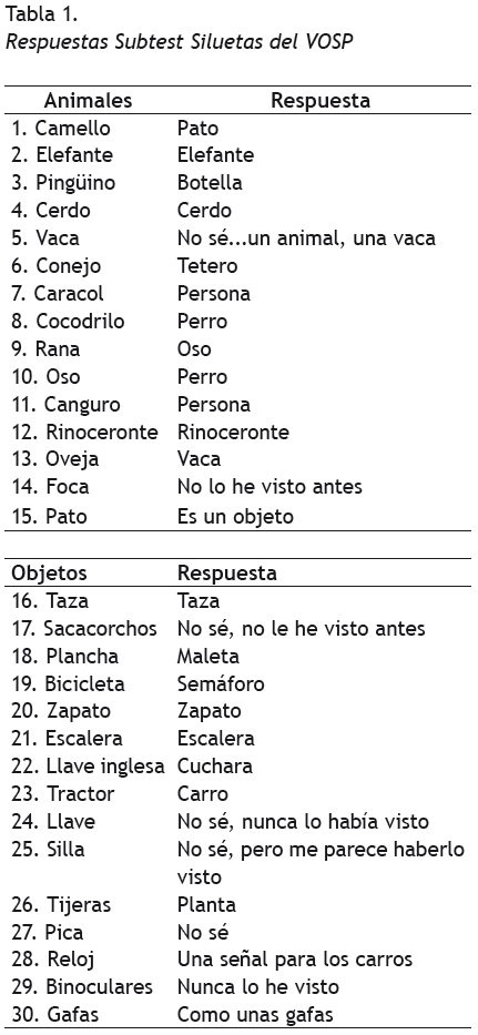 Se evidenciaron dificultades severas en el reconocimiento de estímulos visuales cuando las imágenes son borrosas o están sobrepuestas, además, se encontraron dificultades visuales consistentes en una pobre capacidad para integrar ángulos de las figuras, para la integración holística de los estímulos (centrase en el todo y no sólo en la parte) y para un adecuado manejo espacial. Cabe resaltar que lo anterior afecta sus desempeños en tareas que implican habilidades constructivas y de manejo espacial, ya que a nivel de las habilidades espaciales se encontró incapacidad para discriminar derecha-izquierda en el espacio extracorporal y ubicación de coordenadas. Sin embargo, se pudo determinar que sí logra identificar los estímulos presentados, puede proporcionar la información semántica relacionada con el estímulo sin ninguna dificultad.