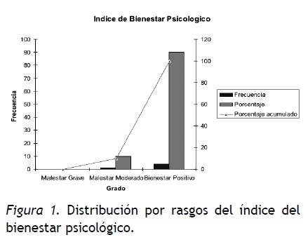 De acuerdo con el índice de bienestar psicológico, el rango de bienestar de las participantes fue clasificado como positivo para cuatro de las cinco participantes, lo cual permite identificar una percepción psicológica favorable tal y como puede observarse en la figura 1, en la que se evidencia que la mayor concentración de datos se presenta en la categoría de bienestar positivo, seguida por malestar moderado. Esto corresponde a que cuatro pacientes respondieron con bienestar positivo y una con malestar moderado, lo que corresponde a que el 80% de la muestra reporta bienestar positivo y el 20% de la muestra reporta malestar moderado.