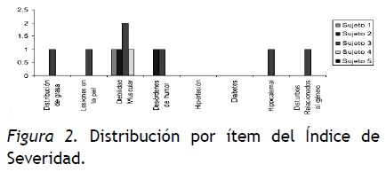 A continuación se presentan los resultados del instrumento índice de Severidad. Según la tabla 3 se puede observar que 2 de las participantes puntuaron 1 (40%), lo que indica que no presentan severidad del síndrome; a su vez, 2 participantes se ubican dentro del rango de severidad media (40%), puntuando 2 y 8, respectivamente; y la última participante (20%) puntuó cero, lo que indica que no hay severidad del síndrome de Cushing.