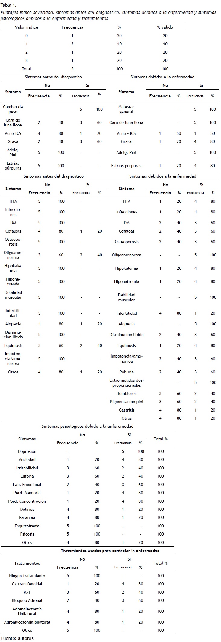 En la tabla 1 se puede observar que los síntomas reportados por todas las pacientes debido a la enfermedad fueron malestar general, cara de luna llena, desproporción en las extremidades, adelgazamiento de la piel, oligoamenorrea, debilidad muscular y alopecia (100%). Los síntomas referidos por la mayoría de las pacientes fueron grasa, estrías púrpuras, hipertensión arterial, infecciones, hipocalemia, hiponatremia, equimosis, aumento en la micción, diabetes, cefaleas, osteoporosis, disminución libido y amenorrea (80%).