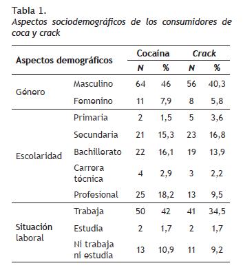 = 11,58 (s = 3,15). En ese sentido, los consumidores de cocaína tenían mayor escolaridad que los consumidores de crack. Se hizo una U de Mann-Whitney y se encontró que había una diferencia estadísticamente significativa entre los grupos, donde los consumidores de cocaína tenían una escolaridad más alta (u = 1902, [74, 63, p < 0,05]) que los consumidores de crack. Por otro lado, la mayoría de ambos tipos de consumidores trabajaban (76,5%). En la tabla 1 se presentan otros aspectos sociodemográficos de los participantes.