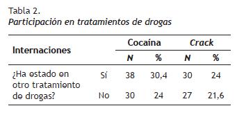 Del total de pacientes, el 54,4% ya habían recibido tratamiento de adicciones, de los cuales el 30,4% eran usuarios de cocaína y el 24%, usuarios de crack. En ese sentido, también nuestro resultado es diferente a otros estudios. Por ejemplo, Ferreira et al. (2003) encontraron mayor número de internaciones entre los consumidores de crack que entre los consumidores de cocaína.