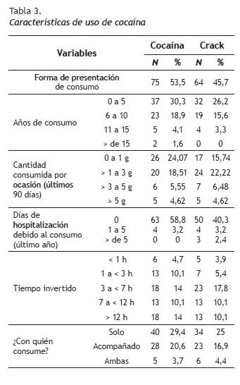 Respecto a los años de consumo, los consumidores de cocaína tienen más años de consumo que los consumidores de crack. De hecho, uno de los consumidores de cocaína informa haberla consumido por 23 años. Esta menor cantidad de años probablemente se deba a que el consumo de crack es mucho más reciente que el consumo de cocaína. En cuanto a la cantidad consumida por ocasión, hay una diferencia importante respecto al consumo de cocaína o crack, donde los consumidores de crack consumen cantidades más grandes de esta droga que los consumidores de cocaína.