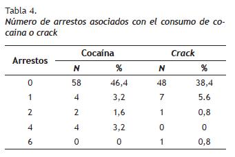 Relativo al número de arrestos, en ambas muestras de consumidores ha habido este tipo de cuestiones legales. En cuanto a los consumidores de cocaína, el 8% de la muestra total han sido arrestados, mientras que de los consumidores de crack lo ha sido el 7,2%. Por lo tanto, del 100% de consumidores, el 15,2% ha sido arrestado por causa de la droga. En cambio, en el estudio de Ferreira et al. (2003) encontraron que más del 57% de una población de consumidores de cocaína o crack habían estado presos a causa de la droga.