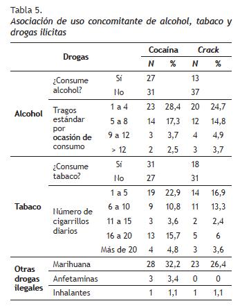La tabla 5 revela algunos datos de uso concomitante con el uso de cocaína o crack, de consumo de drogas lícitas (alcohol y tabaco) e ilícitas (marihuana, pastillas e inhalantes). Respecto al consumo de alcohol, había más consumidores de alcohol entre los usuarios de cocaína que de crack. Se hizo una