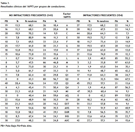 El 28,6 % de los infractores frecuentes (tabla 3) obtuvo puntajes en el polo bajo del factor C (estabilidad emocional), indicando tendencias a mostrarse reactivo y emocionalmente inestable. La media general del grupo (tabla 4) presenta mayor propensión hacia el polo bajo que los no infractores frecuentes.