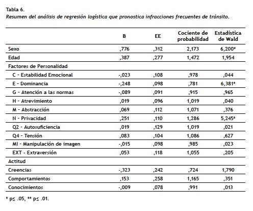En la tabla 6, las variables que asocian significativamente con las infracciones habituales a las normas de tránsito son el sexo, la dominancia y la privacidad. Ser varón, tener menos dominio de la ira, poca asertividad y mayor tendencia a ser re celoso y encerrado en sí mismo, pronostican el ser infractor frecuente de tránsito. Las variables explican el 14,9 % de la varianza de las infracciones habituales. Los hombres tienen 2,17 oportunidades más que las mujeres de ser infractores frecuentes de tránsito. A menor dominancia, la posibilidad de ser infractor frecuente aumenta en 0,78; y a mayor recelo y encierro en sí mismo, la oportunidad de ser infractor frecuente crece en 1,29.
