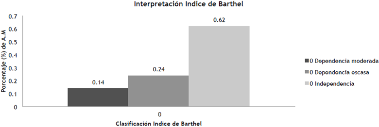 En cuanto a la funcionalidad en las AVD, se muestran en la Figura 2, los porcentajes del índice de Barthel en las tres categorías de calificación. Se evidencia que un 62% de los adultos reportan ser independientes en sus actividades de la vida diaria tanto en su movilidad como su autocuidado, no presentándose dependencia severa, ni total en la muestra estudiada.