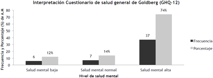 Por otro lado, en relación al Cuestionario de salud general de Goldberg, en la Figura 3, se evidencia la distribución en salud mental de la muestra en tres categorías. El 88% de la muestra se encuentra en las categorías de salud mental normal y alta, encontrándose que solo un 12% presentó puntuaciones valoradas como bienestar psicológico bajo.